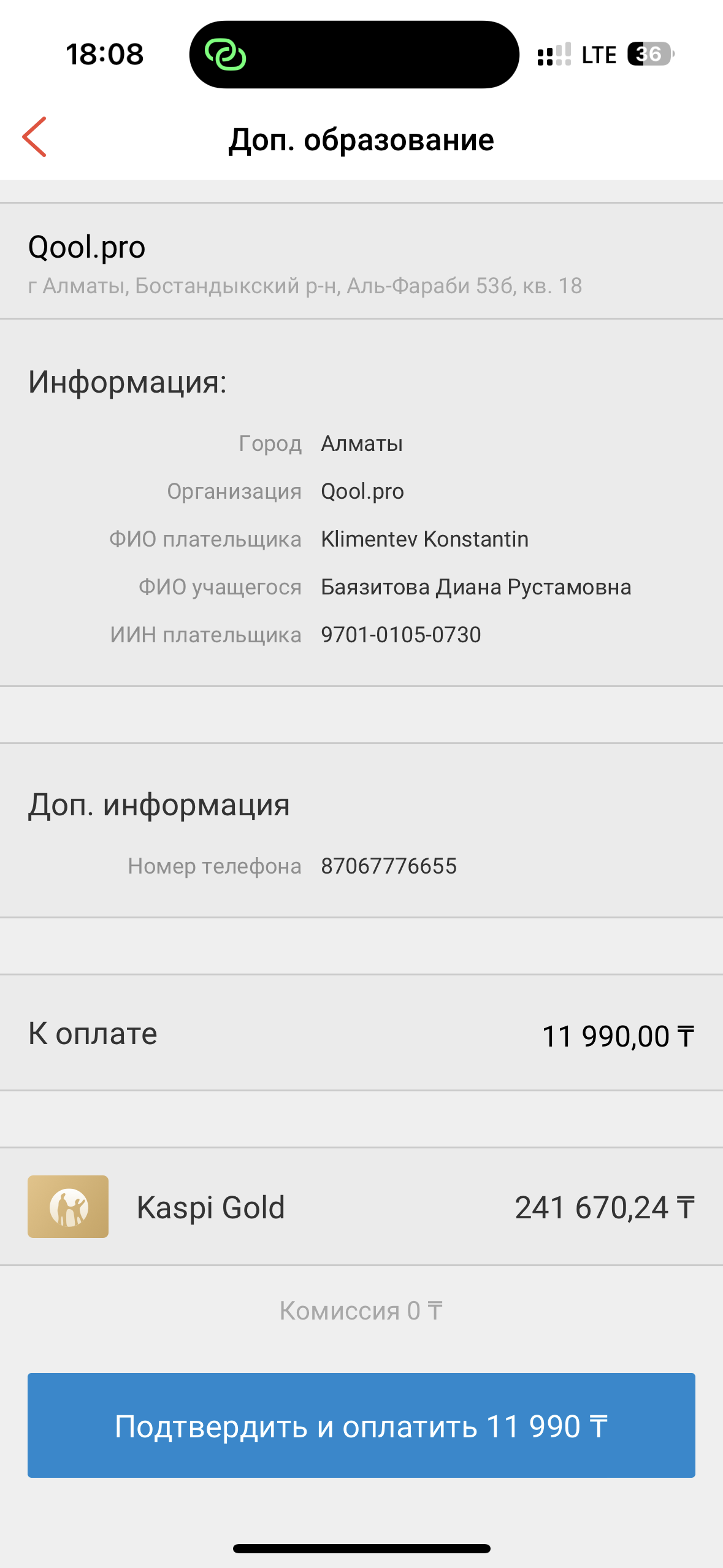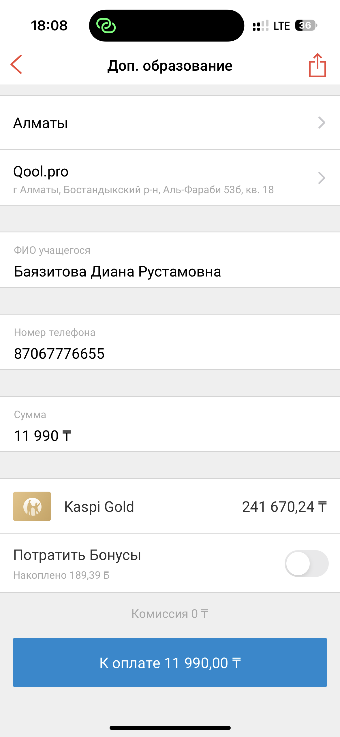 2. В открывшейся вкладке укажите имя, номер телефона и сумму оплаты: 11 990 ₸, далее нажмите на кнопку оплаты
