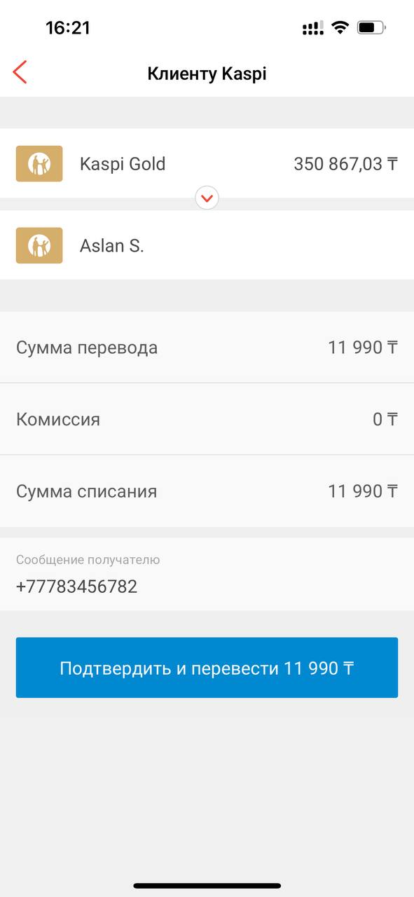 Нажмите кнопку «Подтвердить и перевести 11 990 ₸»