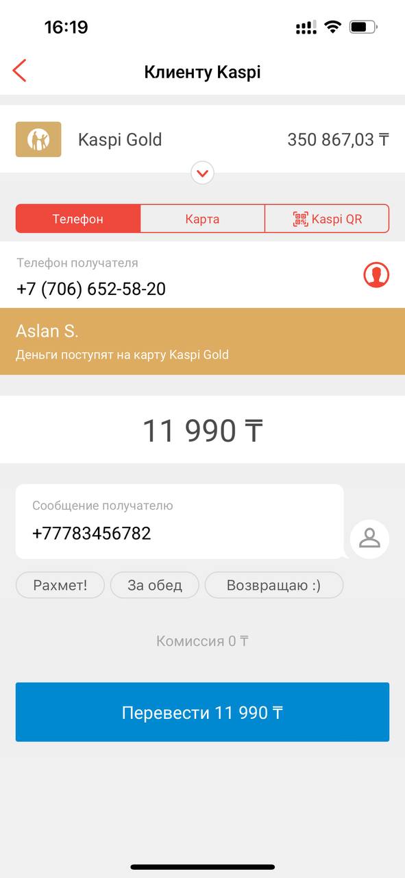 3. В графе «Телефон получателя» введите номер: +7 706 652 58 20