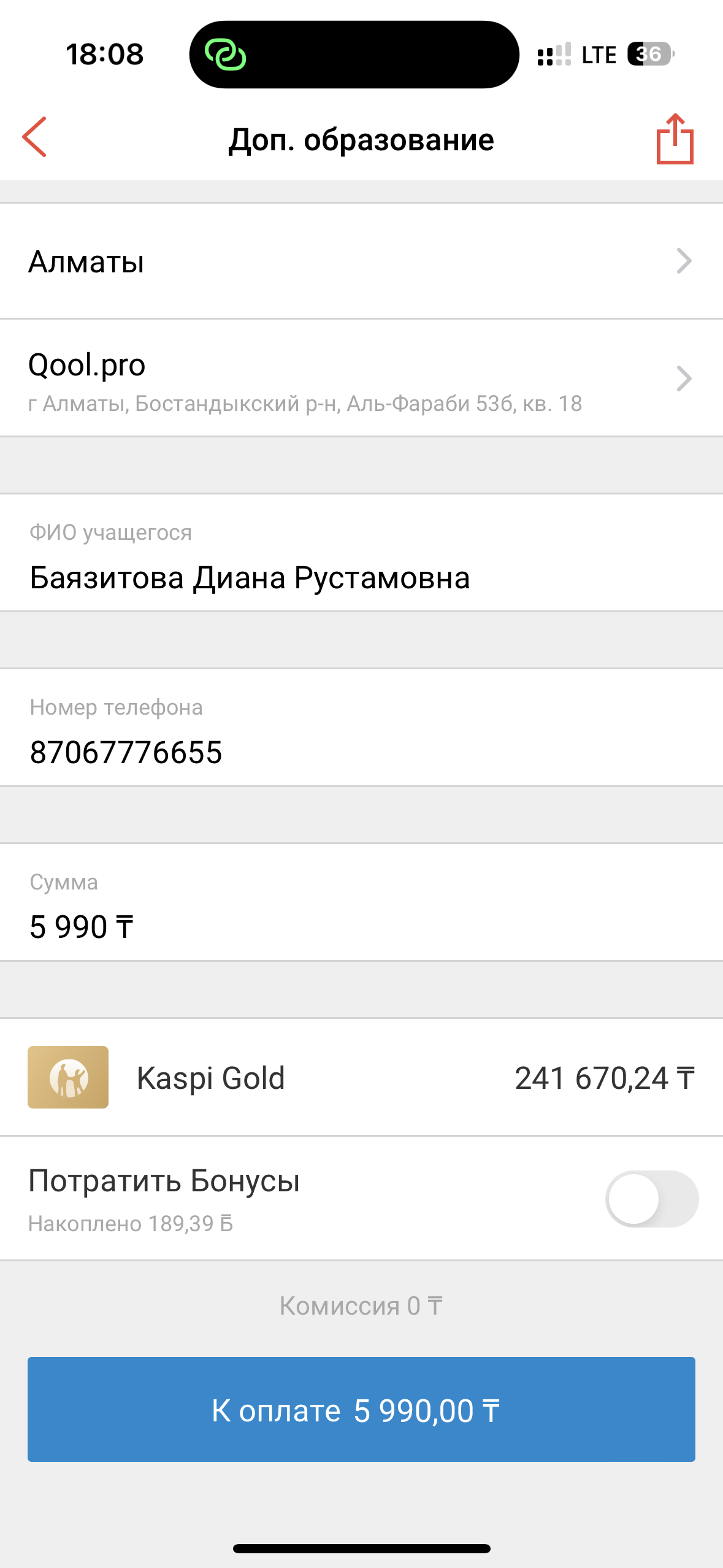 2. В открывшейся вкладке укажите имя, номер телефона и сумму оплаты: 5 990 ₸, далее нажмите на кнопку оплаты