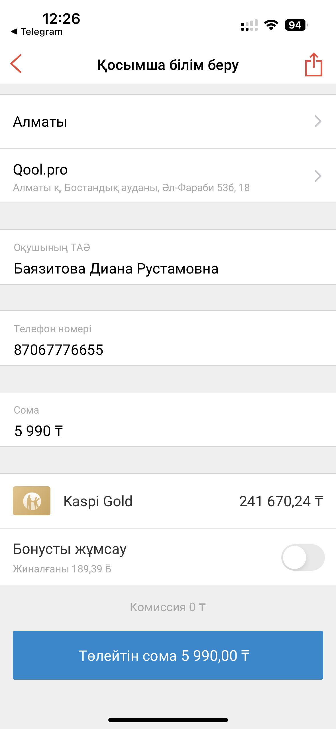 2. Ашылған қойындыда есімін, телефон нөмірін және төлем сомасын көрсетіңіз: 5 990 ₸ содан кейін төлем түймесін басыңыз.